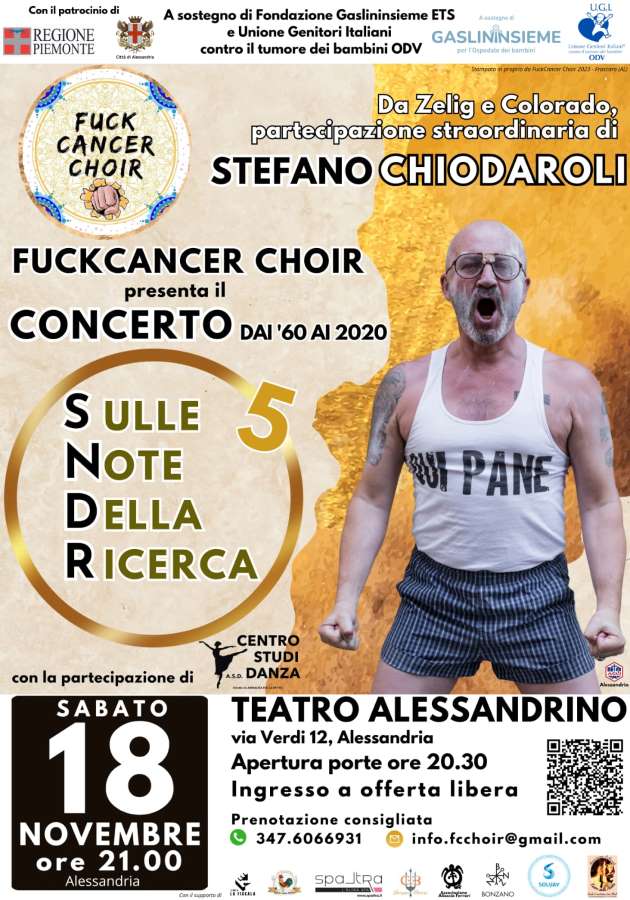 Sabato 18 novembre alle ore 21 al Teatro Alessandrino si terrà la quinta edizione del concerto di beneficenza Sulle Note della Ricerca, organizzato dal FuckCancer Choir, l’ormai noto coro della provincia di Alessandria formato da pazienti oncologici, loro familiari e alcuni operatori sanitari.